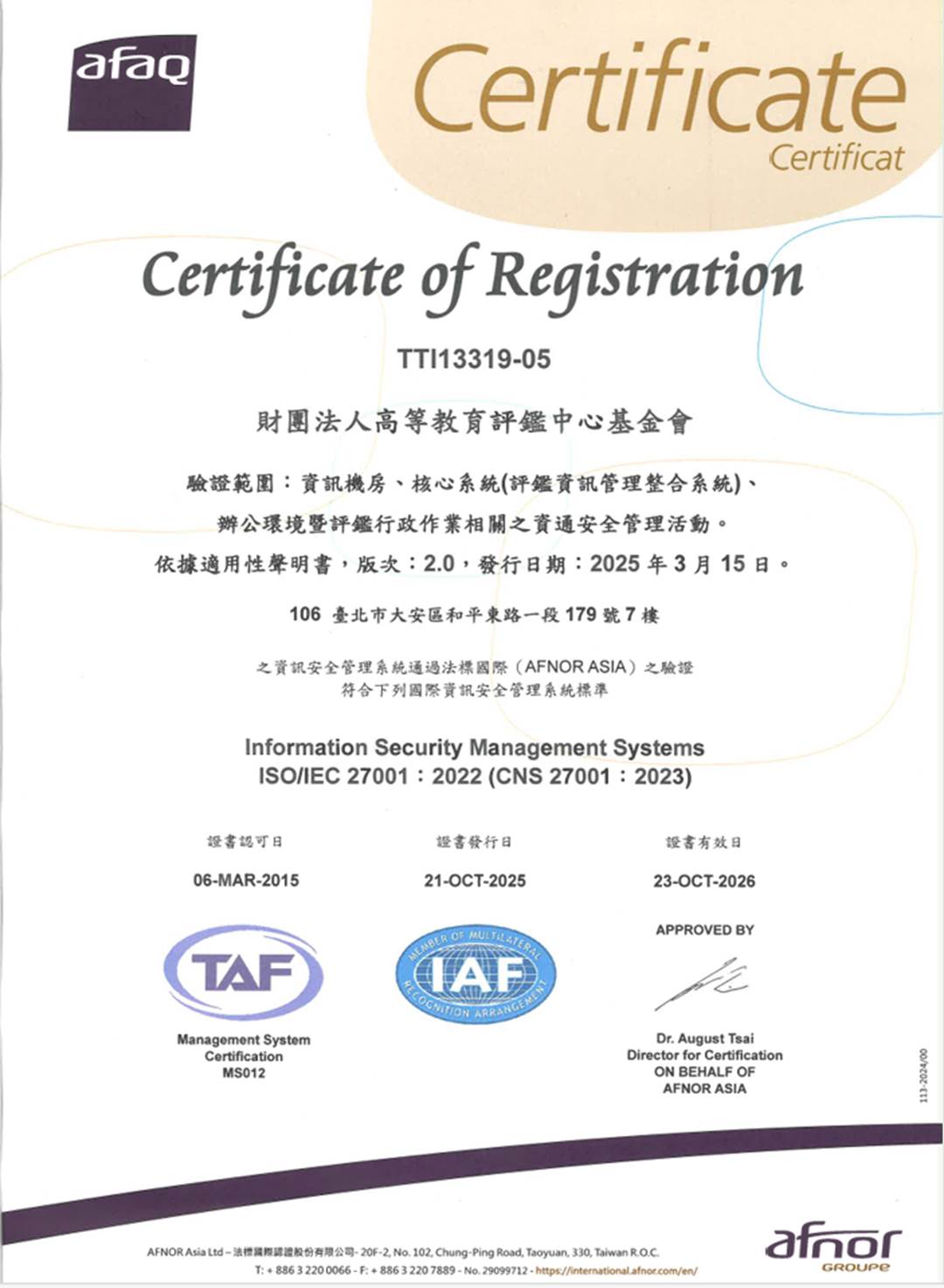 財團法人高等教育評鑑中心基金會(以下簡稱本會)為強化評鑑作業之公正性與專業性,並建立完善之自我監督與品質管理機制,於98年導入並通過ISO 9001品質管理系統驗證,驗證範圍涵蓋大專校院評鑑相關之行政作業管理與服務流程。其後,為進一步強化資訊資產之保護與管理,本會於104年通過ISO 27001資訊安全管理系統認證。