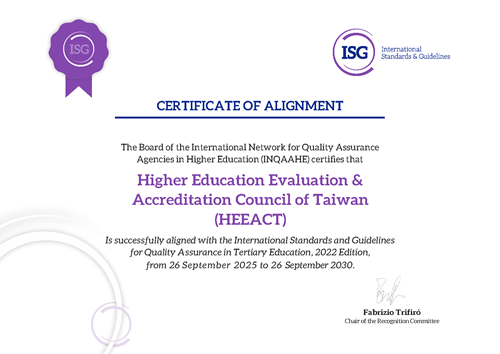 財團法人高等教育評鑑中心基金會(以下簡稱本會)於2025年9月再度榮獲高等教育品質保證機構國際網絡(INQAAHE)「高等教育品質保證國際標準與準則」(ISG)國際認可,成為亞洲首家且唯一達到六項全面符合標準之品保機構,展現臺灣在高等教育品質保證的國際領先地位與制度成熟度。