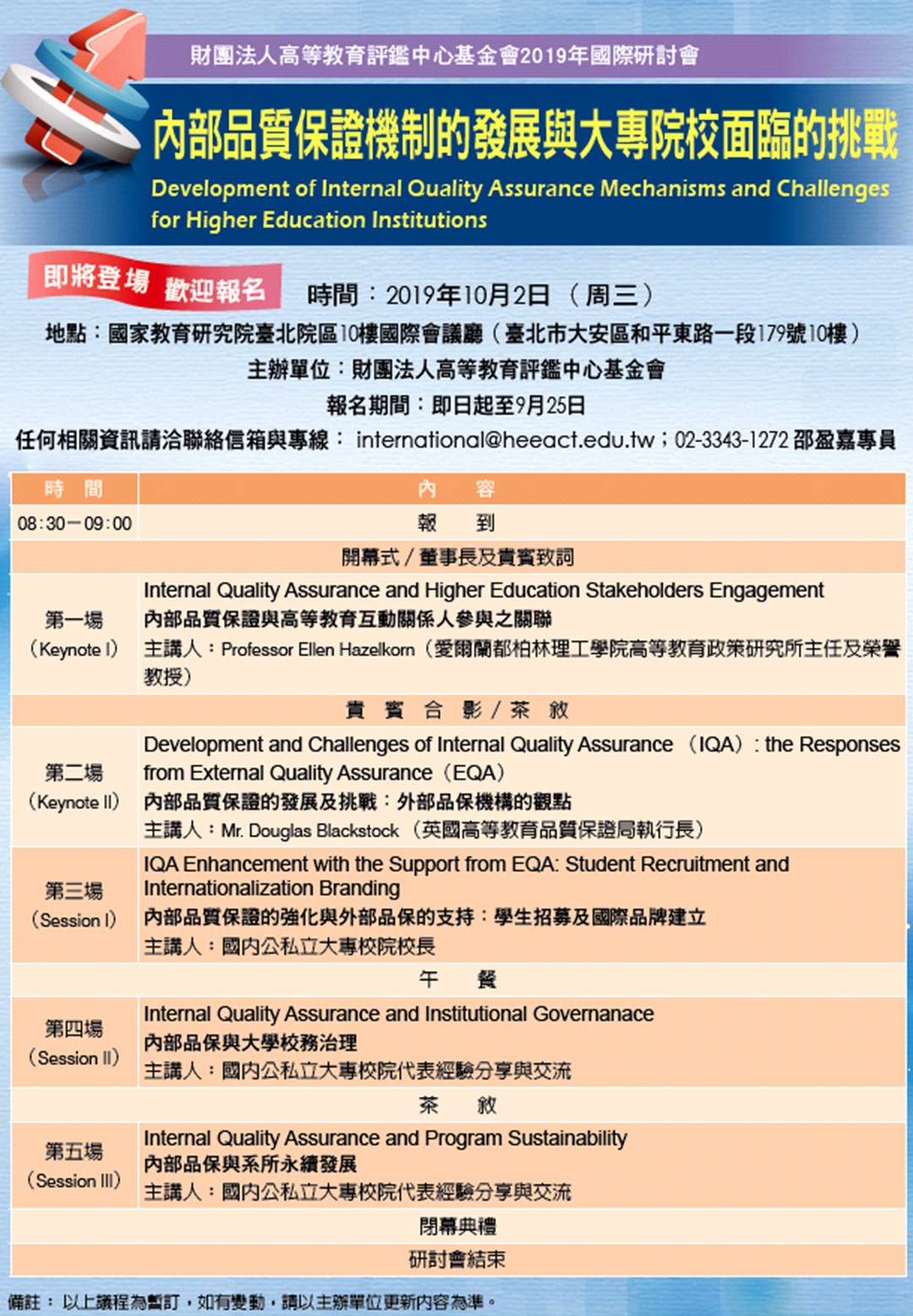 高教評鑑中心2019年國際研討會 內部品質保證機制的發展與大專院校面臨的挑戰