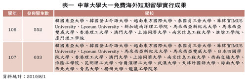 面對激烈的競爭,世界經濟貿易與企業經營都在全球化,具有跨文化能力與移動意願的人,成為企業急切尋覓的人才。因此,中華大學全額補助大一學生海外短期留學5天4夜,學校全額負擔機票交通、餐膳食宿,及學習費用;學生則是依照自己的興趣,選擇學習主題,前往韓國、日本、新加坡、馬來西亞、泰國、菲律賓、越南、香港、澳門、中國大陸等東亞、東南亞國家或地區體驗學習。