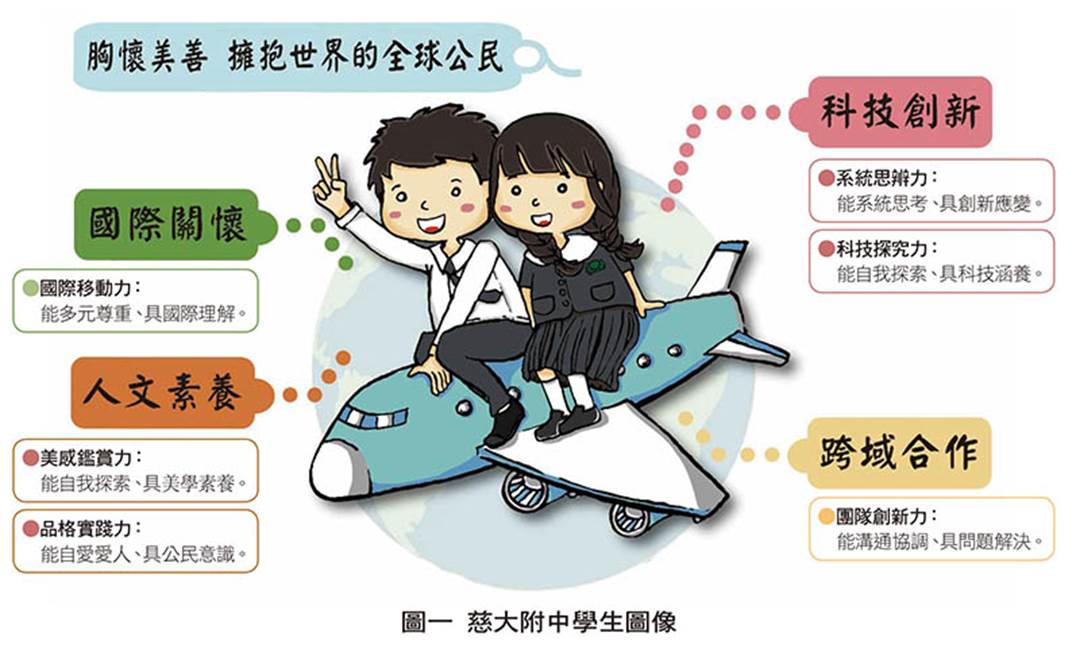 慈大附中善用高中優質化的資源系統,於106學年度起,由校長帶著學校老師,以工作坊的方式,深解新課綱,並重新討論學生圖像。完成學生圖像後,參照總綱中的三面九項核心素養,討論出學校願景─培育出「胸懷美善擁抱世界的全球公民」。期望透過正式課程、非正式課程、潛在課程與新課綱所提倡的自主學習等,培育出擁有國際移動力、品格實踐力、美感鑑賞力、系統思辨力、科技探究力、團隊創新力的世界級公民。