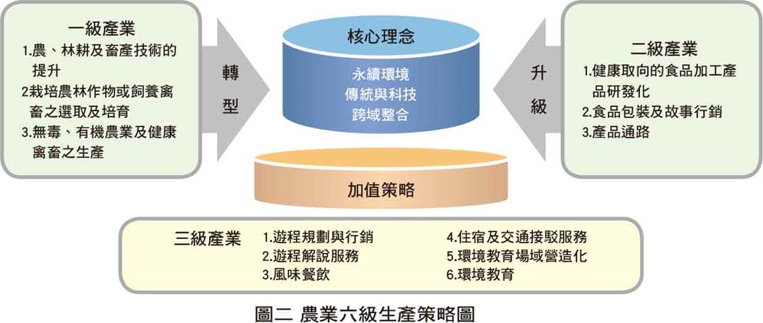 我們也了解林下經濟的推動,不僅思考如何建立林下生產技術體系,收成後的加工加值與行銷經營也很重要,因為好的商品如無行銷管道,導致產品滯銷,也無法創造能夠說服人的經濟模式。因此研究團隊進一步與青創團隊、NPO、在地組織、加工業者、店家、小農等合作,以「里山倡議」為核心精神,「林下經濟六級產業化」策略,期望以農業與農村為主體,透過一級農業結合二級加工與三級體驗與行銷,透過產業六級化,形成更高附加價值的服務性商品,使山村部落生產者的收益增加,如圖二。